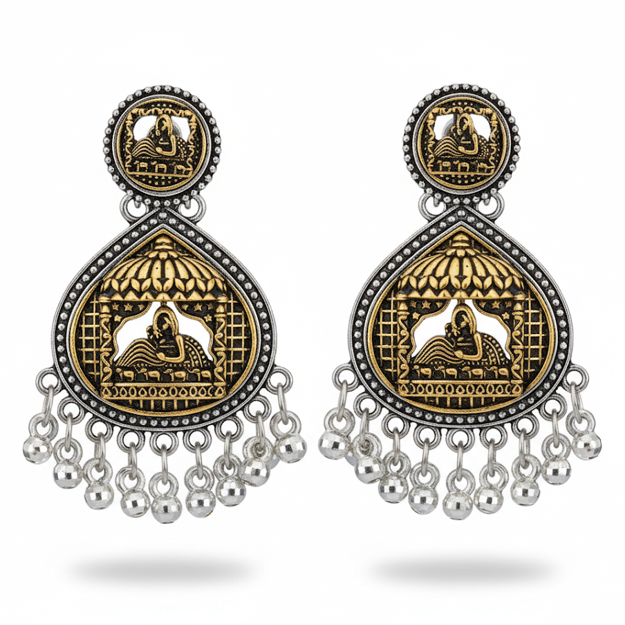 Embrace timeless tradition with these Oxidized Silver Gold-Plated Temple Earrings.